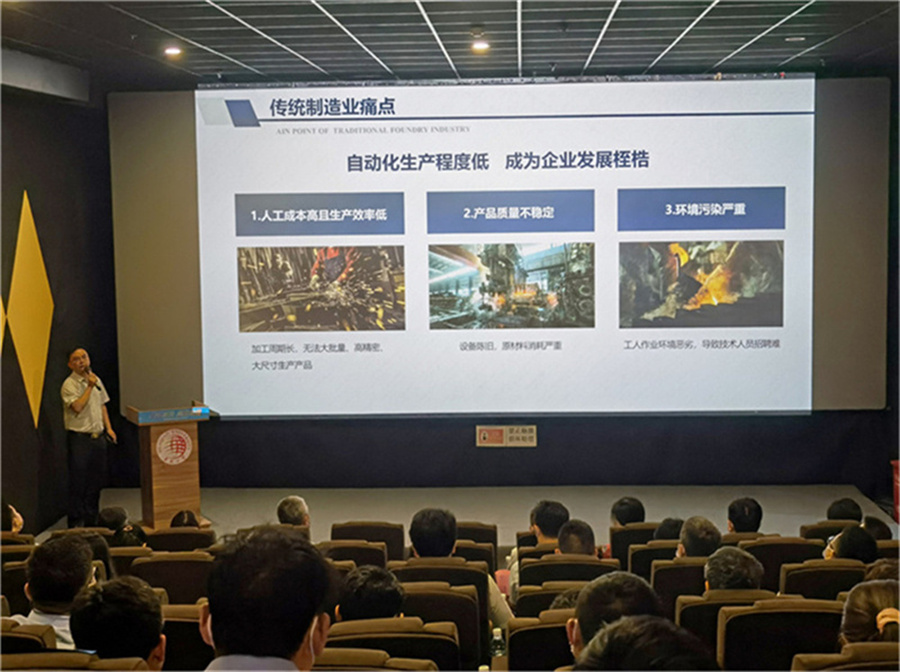 廈門鼎鑄智能設(shè)備有限公司(以下簡稱“鼎鑄”)作為企業(yè)代表出席,并應(yīng)邀上臺分享了傳統(tǒng)鑄造行業(yè)下校企如何攜手創(chuàng)新突破瓶頸,成為此會議六家企業(yè)代表發(fā)言之一