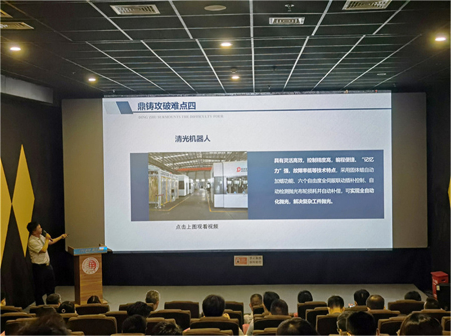 張總監(jiān)介紹到鼎鑄以先進的生產(chǎn)工藝和頂尖的技術(shù)力量突破多項鑄造難題,自主研發(fā)創(chuàng)新制造出:低壓鑄造機、清光機器人、數(shù)控鋸切機、機器人打磨單元、全自動射芯機、重力澆鑄機等多款智能化設(shè)備,能幫助企業(yè)解決傳統(tǒng)鑄造、拋光打磨等難題,助力行業(yè)發(fā)展。